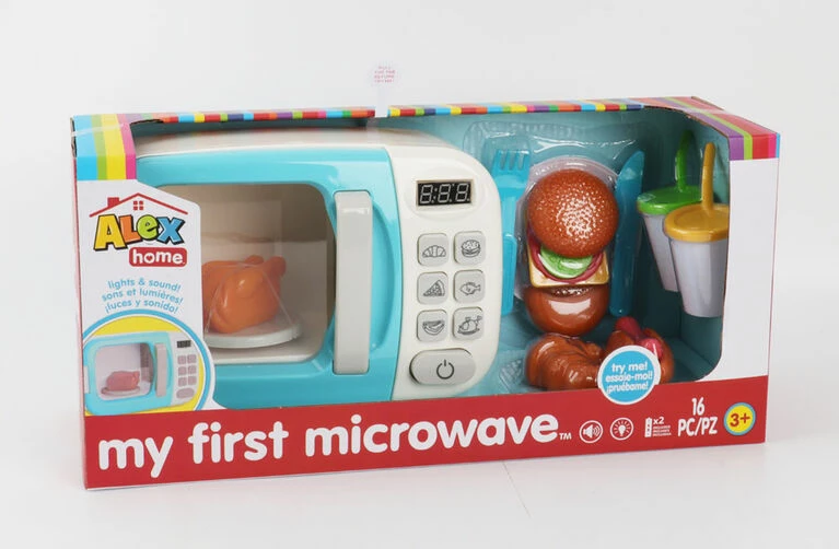 My First Microwave:A pretend microwave with realistic light and sound effects plus an assortment of plastic toy foods including a hot dog, roast chicken, croissant, a yummy cheeseburger with pickles and tomato, two cups, plate, knife and fork. Product dimensions: 23cm x 12cm x 15.2cm (9.06 inches x 4.72 inches x 5.98 inches) Your child will quickly learn how to prepare food in the kitchen like the grown-ups they see at home. Simply place the food inside the microwave, press the illustrated button of your choice, and watch as the food spins until the timer goes off – just like a real microwave! This toy requires 2 AA batteries, which are included. Designed for boys and girls ages 3 and up. Please note that the microwave does not actually heat up food.