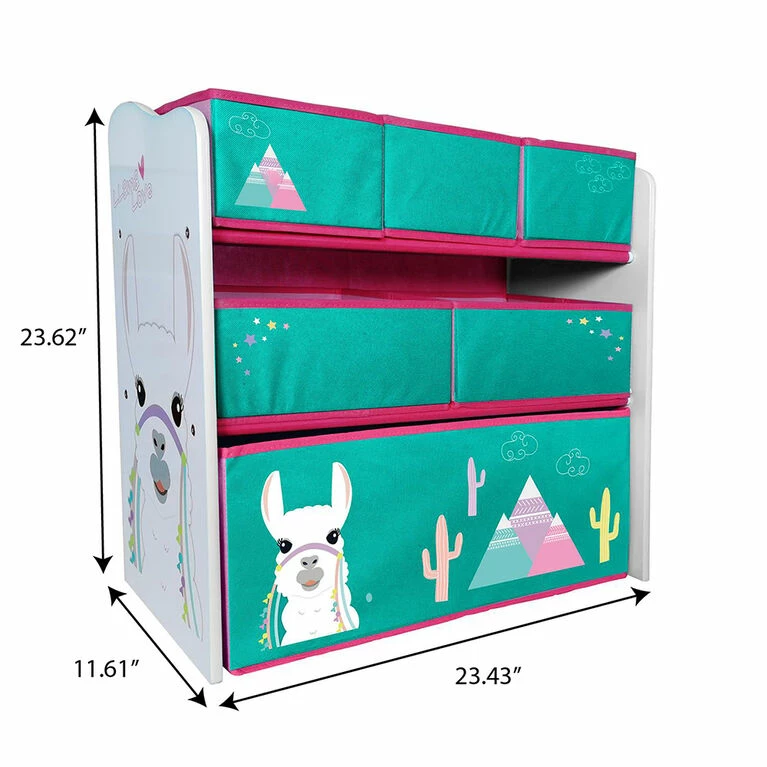 Perfect addition to your little ones room. 3 layer organizer with shelf for books and 6 bins for storage. Llama themed. F and pine and 6 non-woven drawers.