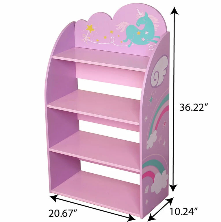 This Storage Bookcase has 4 shelves for books or decorative items and toys. Built with MDF E1. Pink unicorn theme