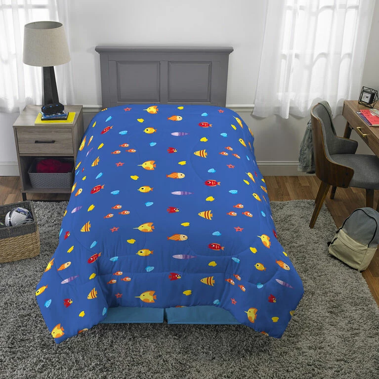 Transform your child’s room into a bright and fun resting place with this Baby Shark “Shark Family” comforter. This vividly printed Twin/Full sized comforter will add underwater ambiance to your little ones room. The comforter front shows Baby Shark and his family happily swimming through the depths of the ocean. The comforter reverse shows a toss of smiling sharks and stars. This Baby Shark comforter makes a perfect gift for any child. Pair this comforter with the coordinating sheet set (sold separately) to have your child singing with joy! This twin/full sized comforter measures 72″x86″ and is 100% polyester microfiber, making it easily machine washable.