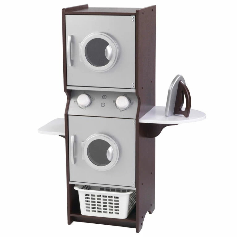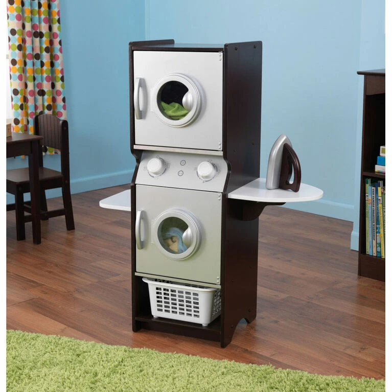 The KidKraft Laundry Play Set lets kids clean and dry their clothes just like Mom and Dad. This kid-sized stacking washer and dryer set is colorful and fun. It includes a play iron, a laundry basket, shelving and a chalkboard on the side. With its realistic design and interactive pieces, this sturdy play set has plenty of play value. Doing the laundry has never been this much fun!